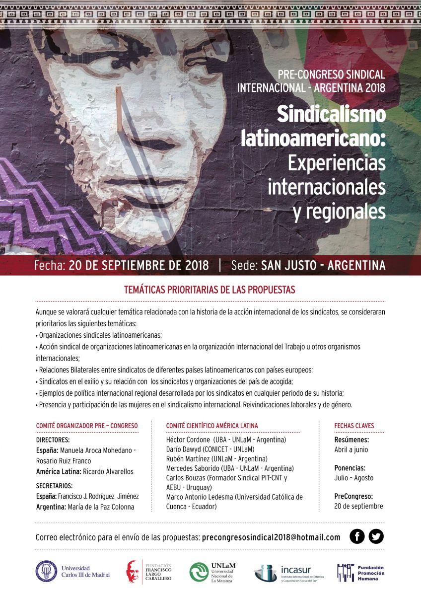 Junto con la Universidad Carlos III de Madrid, Fundación Francisco Largo Caballero, y Universidad Nacional de La Matanza; Incasur y Fundación Promoción Humana organizan la jornada “Sindicalismo latinoamericano: experiencias internacionales y regionales” el 20 de septiembre en San Justo (provincia de Buenos Aires).