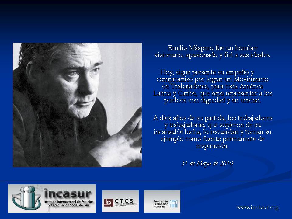 "Emilio Máspero presente y futuro", creada en marzo de 2001 como un organismo de promoción social para continuar, profundizar y proyectar su obra, quiere hacer llegar a los trabajadores y trabajadoras en general y a los latinoamericanos-caribeños en particular, algunos elementos de "su legado" mediante el siguiente documento.